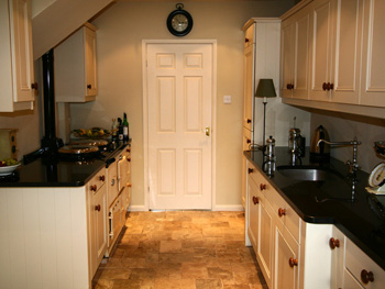 This kitchen is an example of a customer-specified bespoke kitchen; the hand-painted units and dark Granite work surfaces were all produced according to the customer's requirements.